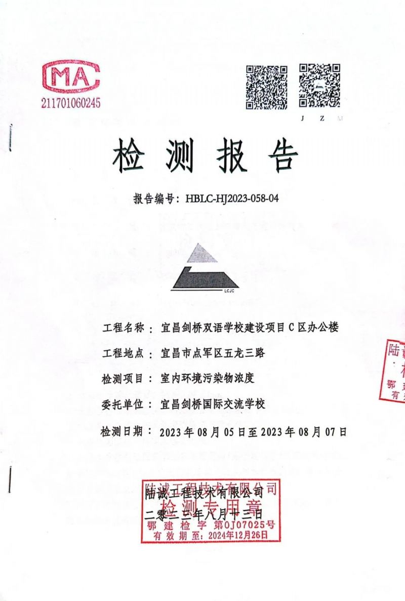 經(jīng)具有環(huán)境檢測資質(zhì)的陸誠工程技術(shù)有限公司對(duì)宜昌歐陽修學(xué)校(宜昌劍橋國際交流學(xué)校)新校建設(shè)工程進(jìn)行全面檢測,學(xué)校A區(qū)學(xué)生宿舍1#樓、A區(qū)學(xué)生宿舍2#樓、B區(qū)風(fēng)雨操場、C區(qū)辦公樓、D區(qū)教學(xué)樓均已合格。