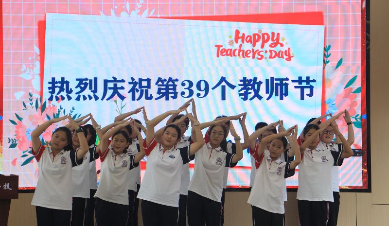初中部同學(xué)代表,用手勢歌舞“聽我說謝謝你”,向老師們傳達(dá)了他們的感恩之情。孩子們純稚的歌聲令人感動(dòng),每一句“聽我說謝謝你”都如同星辰一般,照亮了整個(gè)會場,也點(diǎn)亮了每一顆心。音樂停止的那一刻,臺上臺下,無論師生,心都仿佛融為了一體。