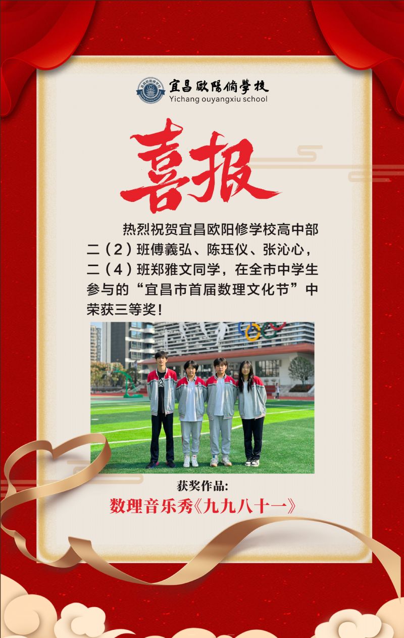 祝賀高二年級張沁心等同學在“宜昌市首屆中學生數(shù)理文化節(jié)”中獲獎!