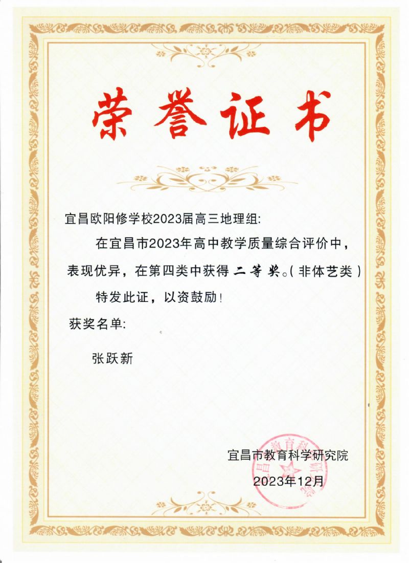 在宜昌市2023年高中教學(xué)質(zhì)量綜合評價中,我校高三地理教研組表現(xiàn)優(yōu)異,榮獲同類學(xué)校二等獎。