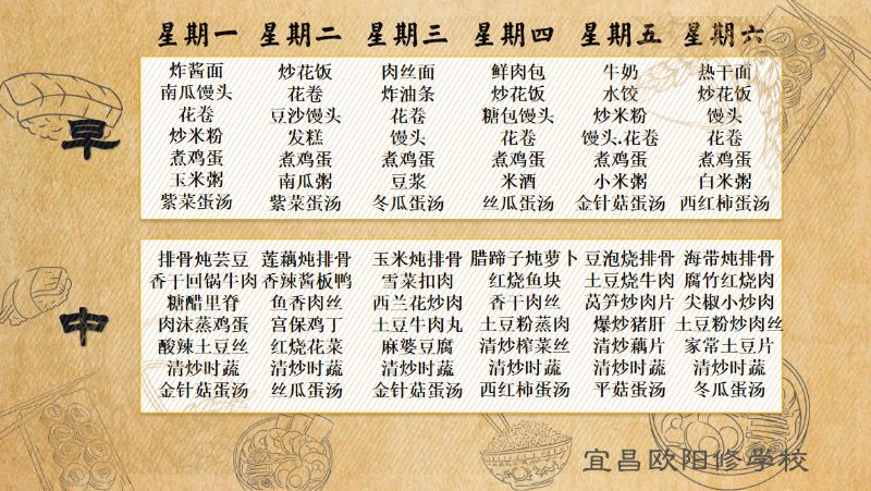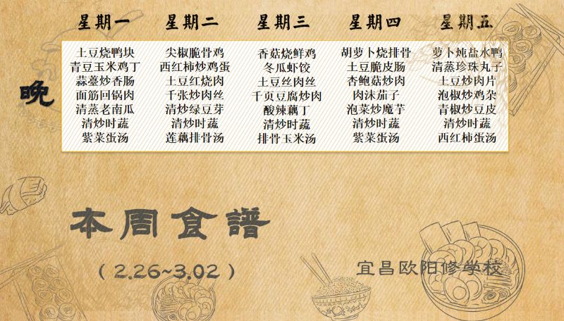 宜昌歐陽修學校每周食譜(2月26日至3月2日)