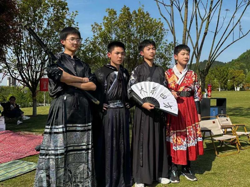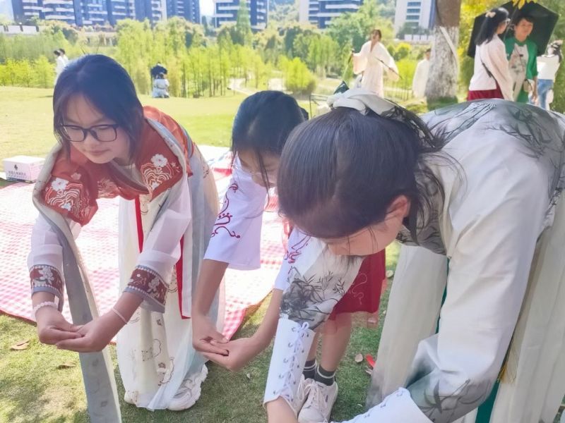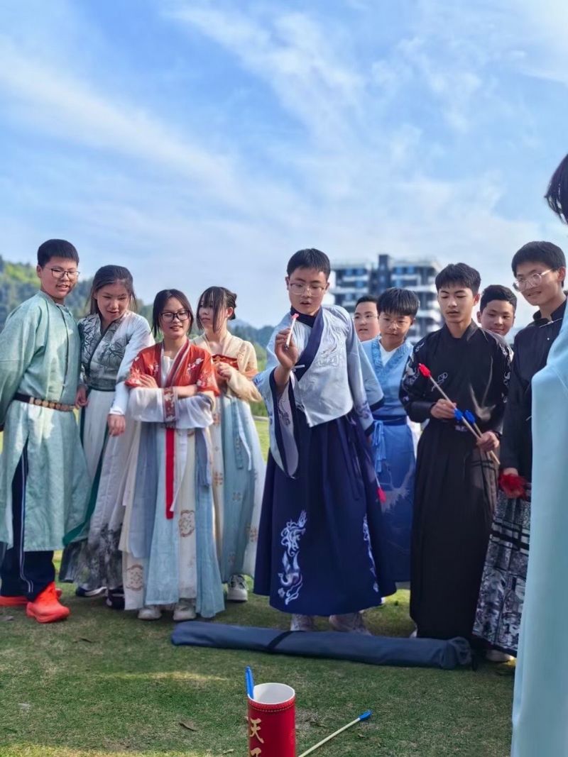 上巳正值暮春時(shí)節(jié),春天的特點(diǎn)是“生發(fā)”,所以民俗也提倡人們多活動(dòng),熱愛生命。為復(fù)原古人雅集盛況,活動(dòng)還設(shè)置了傳統(tǒng)的運(yùn)動(dòng)項(xiàng)目——踢毽子和投壺,同學(xué)們穿著漢服,雖襟飄帶舞,卻不影響其大展身手。