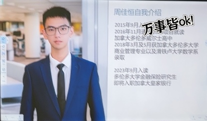 周佳恒是第8屆 OSSD 2+1中加班項目的杰出學(xué)生。 2013年7月-2015年7月在國內(nèi)完成了高一高二雅思、數(shù)學(xué)、物理、化學(xué)、生物課程, 然后2015年9月赴加拿大威爾士高中-宜昌歐陽修學(xué)校的合作學(xué)校學(xué)習(xí), 2016年6月完成了高三密集課程, 直升世界排名前166名的滑鐵盧大學(xué)。 2023年7月 在世界排名前16名的多倫多大學(xué)讀完了碩士研究生課程。2024年4月就職于加拿大皇家銀行。