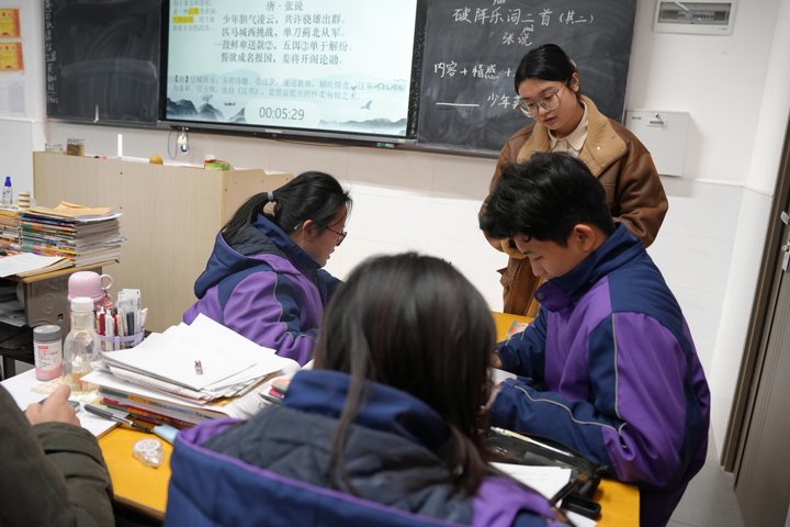 推開206班的教室門,同學(xué)們正齊聲朗誦詩歌,秩序井然。譚老師為課堂設(shè)置了兩個教學(xué)探究題,讓學(xué)生通過自主學(xué)習(xí)、小組交流討論、集中展示等環(huán)節(jié)深入把握詩歌內(nèi)涵,理解少年英雄的形象特點,探討詩歌語言特色。探究重點突出,目標(biāo)明確。課堂最后讓學(xué)生書寫心目中的少年英雄形象,引導(dǎo)學(xué)生在生活中用實際行動踐行“少年膽氣凌云,共許驍雄出群”的氣魄與擔(dān)當(dāng)。