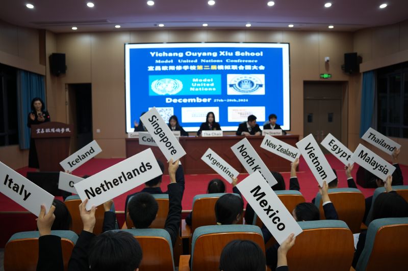 宜昌歐陽修學校國際部第二屆MUN模擬聯(lián)合國大會于2024年12月26日晚上6:30-8:30在教學樓五樓大會議室舉行,國際部5位模聯(lián)主席團成員以及來自高一年級的34位模擬聯(lián)合國代表將扮演各個國家的外交官,用全英文闡述FoodSafety世界食物安全問題,給全校師生展示英語學習的趣味性和重要意義。